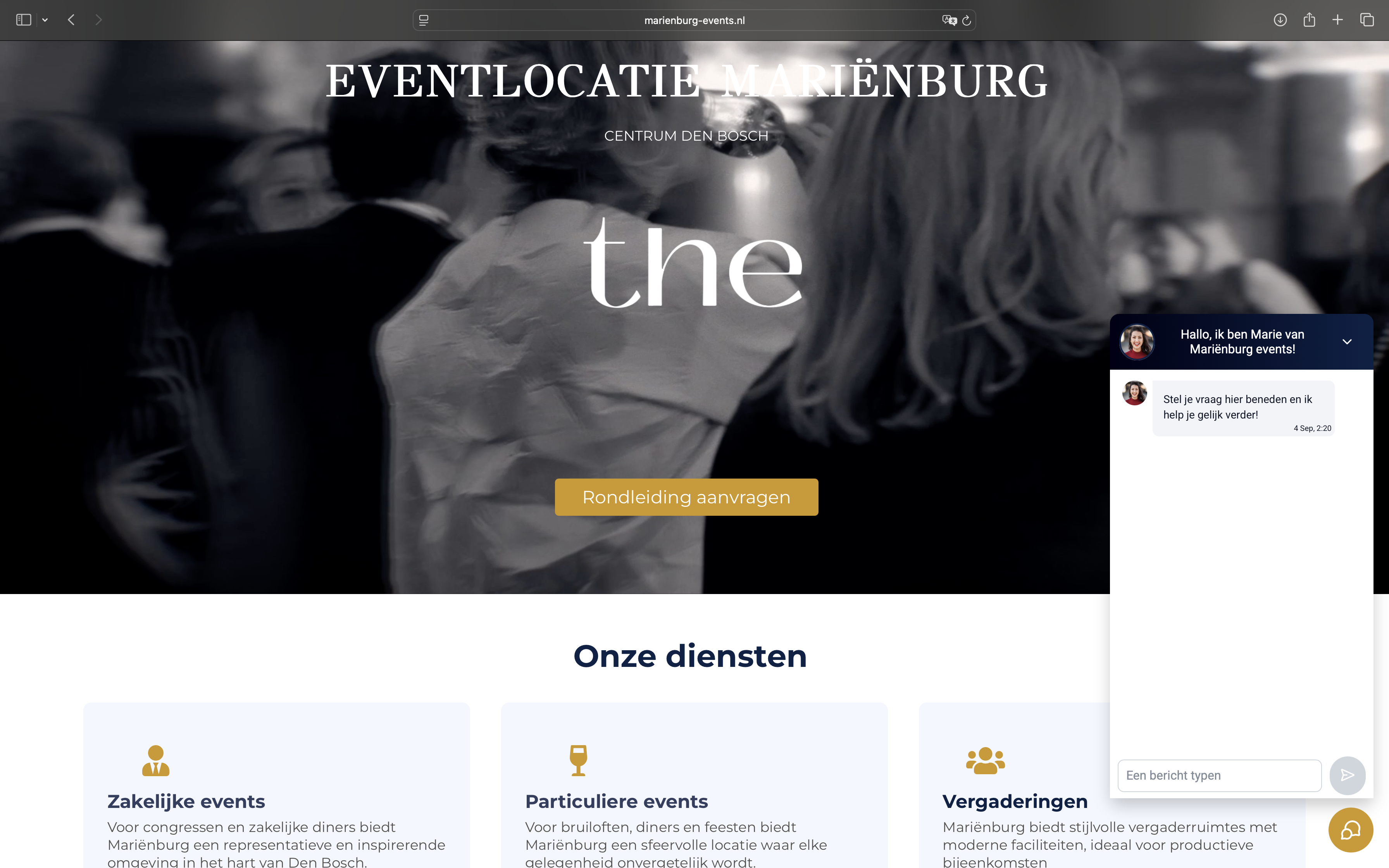 vangt vragen op de site op, beantwoordt direct en plant rondleidingen in de agenda. (Bezoekers worden actief gewezen op “Marie” via het chat-icoon rechtsonder.) (marienburg-events.nl)